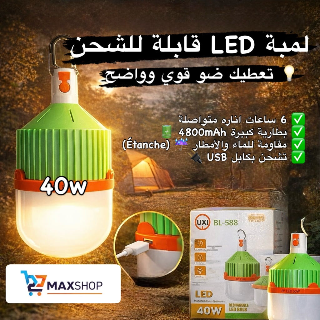 لمبة LED قابلة للشحن UXI BL-588 💡 تعطيك ضو قوي وواضح، مثالية للدار، للسطح، للڤاراج، وللكامبينغ وقت يقطع الضو 🌙🔋