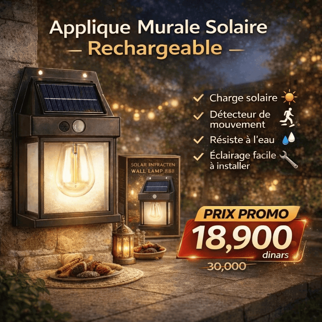 لمبة حائط شمسية قوية وذكية، تخدم بالطاقة الشمسية وتتشحن وحدها في النهار 🌞 تضي تلقائياً في الليل وقت اللي يصير تحرّك بفضل حساس الحركة 🔦 مقاومة للمطر والهواء، ومناسبة للاستعمال الخارجي.